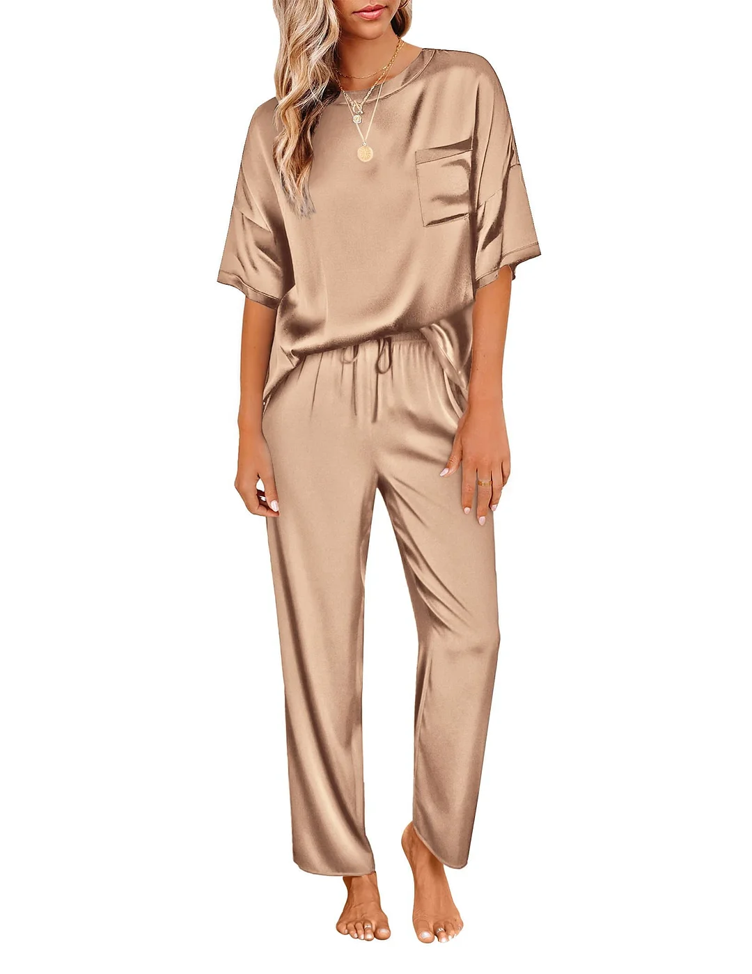 DAKIMOE Womens Silk Satin Pajama Set Short Sleeve Shirt with Long Pajama Pant Set Two-piece Pj Sets Soft Sleepwear Loungewear Nightwear Button-Down Pjs S-2XL