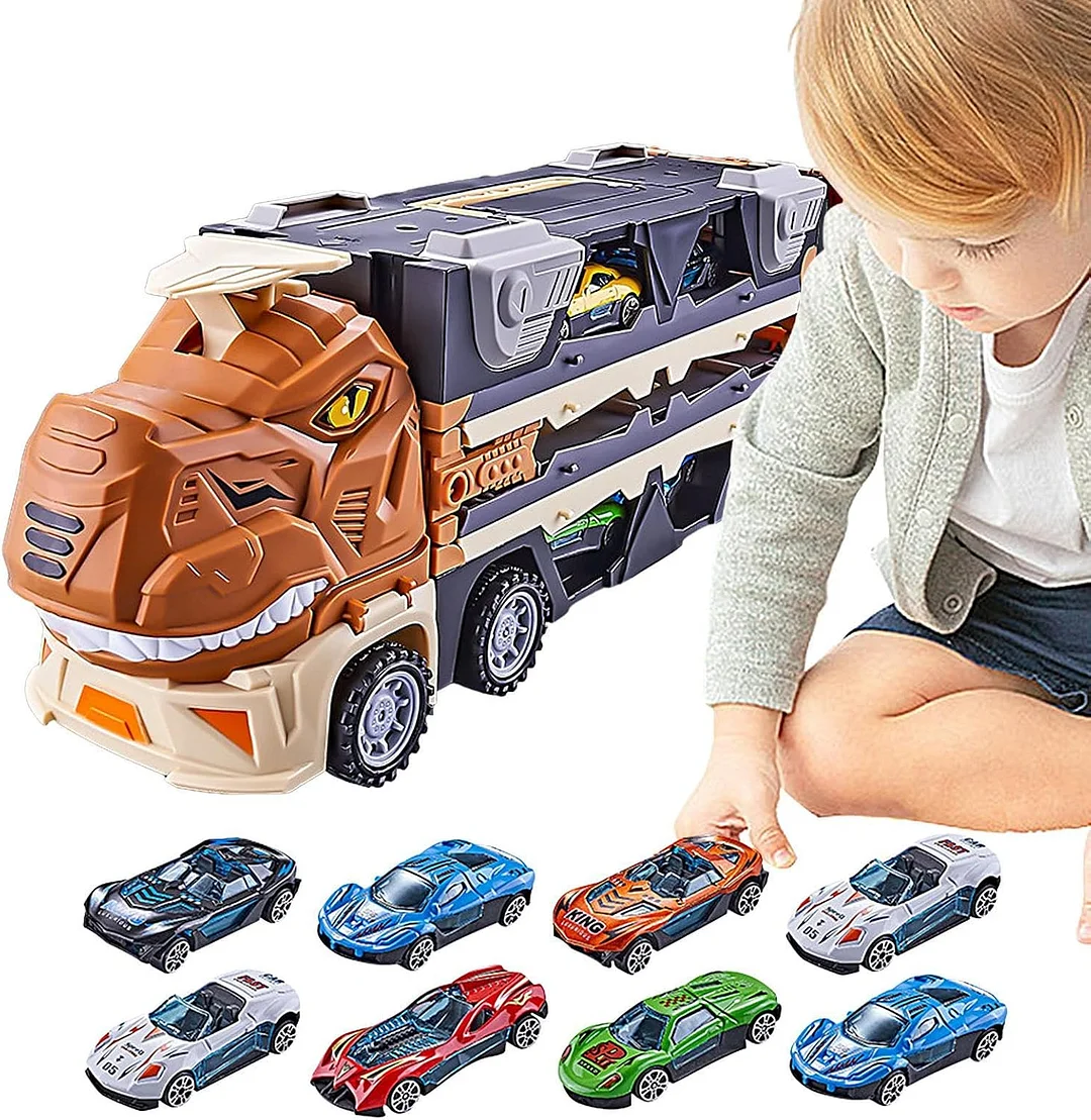 Dinosaur Truck Toys for 2 3 4 5 6 7 Year Boy Toddler, Foldable Track & 2 Player Race Mode, Light & Sound Transport Carrier W/ 8 Dino Car, Birthday Gift Idea for Kids Girls