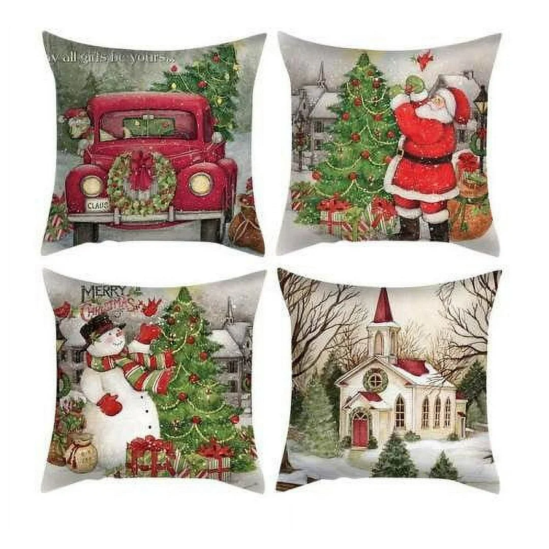 Sanmadrola 4 Pack Christmas Throw Pillow Covers 18''x18'' Velvet Christmas Decor Scenery Throw Pillow Covers for Christmas Sofa Couch Home Decoration Set of 4