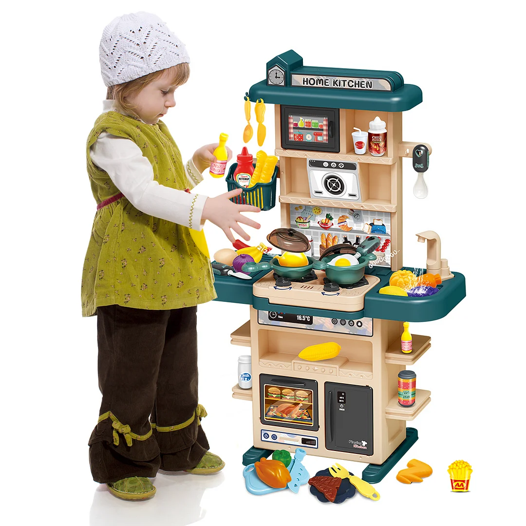 --Sanmadrola toddler kitchen playset will be the perfect and ultimate kitchen toy for your kids. This kitchen for kids is designed to inspire imaginative play and curiosity, providing endless hours of entertainment. This 29 inch tall play kitchen is a perfect fit for toddlers aged 3-8, providing a realistic kitchen experience without the hazards of a real kitchen. The toddler kitchen set includes a comprehensive set of 43 pieces of rich toy accessories, including pretend food and kitchen accessories, making it a complete kitchen set for kids ages 3-5.