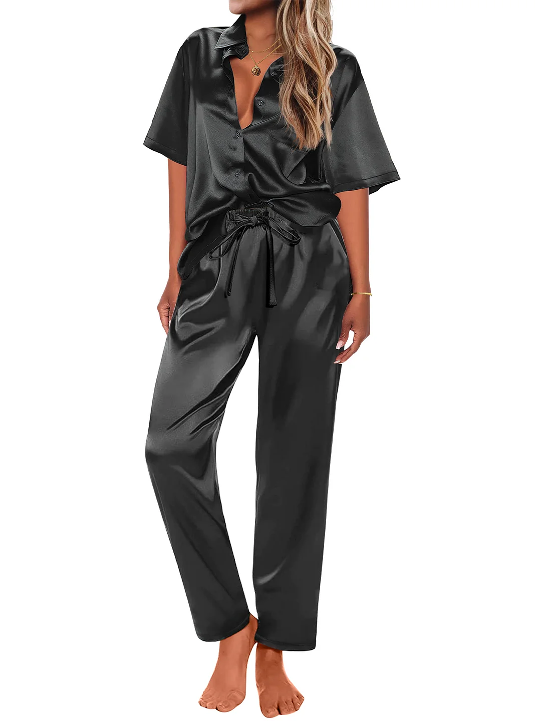 Womens Satin Silk Pajama Sets Short Sleeve Button Down Pajamas for Women 2 Piece Pjs Soft Lounge Sets for Women Sleepwear with Long Pant S-XL